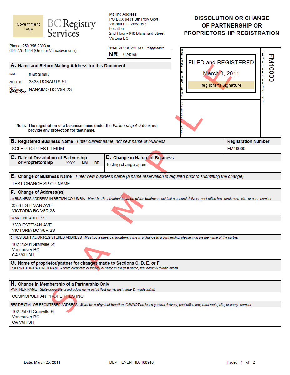 Note that Sample Report is an actual report used at BCRS. Presented image was edited for security and legal reasons. All data shown is dummy data; all addresses, postal codes and various numbers and ID's have been altered. Government logo and Registrar's signatures have been covered with beige box. Also word SAMPLE has been added across the image.